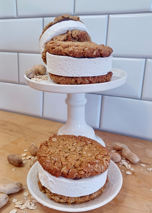 A vanilla marshmallow sandwiched with chocolate between two scratch-made peanut butter oatmeal cookies.